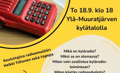 Nyt mukaan kokeilemaan VHF68-radiopuhelimia ja kyläradiota! Opi näiden radioiden perusteet ja tule mukaan kyläradiotoimintaan! Kouluttajina radioamatööri Heikki Tiihonen sekä Vapepa. 18.9. klo 18 kylätalolla! Lue lisää"VHF68-radiokoulutus kylätalolla 18.9."
