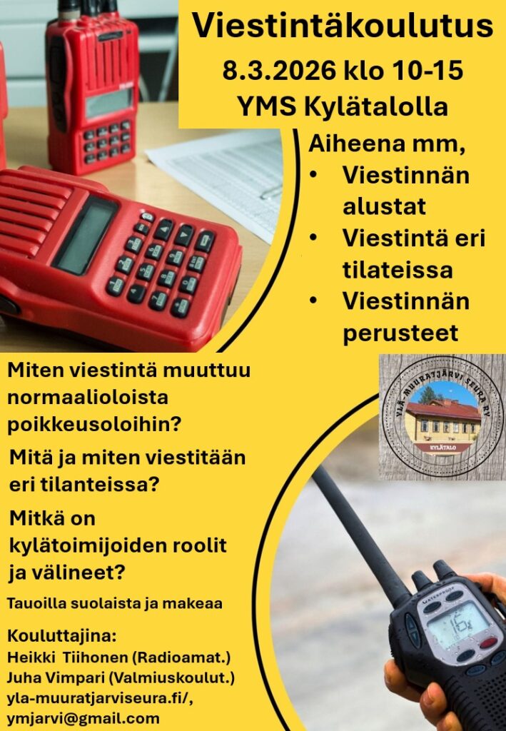 Kaikille avoin kriisiviestinnän koulutus kylätalolla 8.3. klo 10-15. Kouluttajana Juha Vimpari Vapepasta. Koulutuksessa käsitellään kyläradiota, kyläradiotoimintaa, metsästysradioita, viestiryhmiä ym.