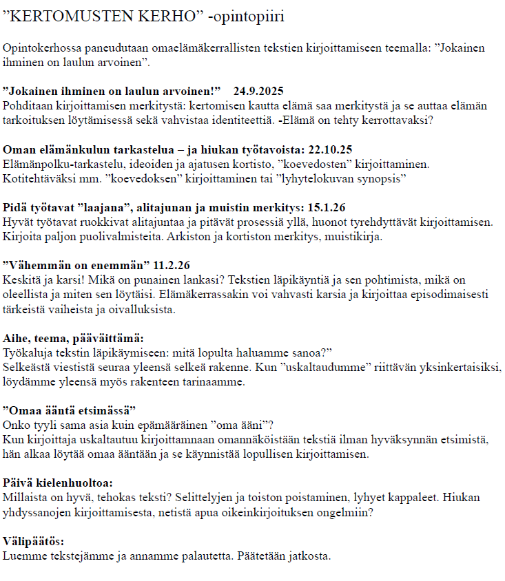 Kirjallisuuspiiri 11.2.2026 klo 18 kylätalolla. Aiheena elämäkertakirjoittaminen, ohjaajana toimittaja ja kääntäjä Jaakko Luoma. Tervetuloa kaikki kirjoittamisesta kiinnostuneet! Voit tulla tekstin kanssa tai ilman.